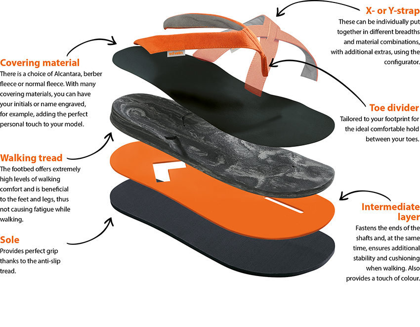 Η συγκεκριμένη ανατομία του πέλματος δεν υποστηρίζει μόνο το μήκος της καμάρας, αλλά επίσης τοποθετεί τη φτέρνα ανάλογα, έτσι ώστε να αποτρέπεται η υπέρβαση των τυπικών σαγιονάρων. Η μέτρηση των ποδιών σας εγγυάται την τέλεια εφαρμογή στην περιοχή των δακτύλων, προκειμένου να αποφευχθεί η εμφάνιση των ποδιών. Κατόπιν αιτήματος, οι αποκλειστικοί συνεργάτες της NovaPED μπορούν να τοποθετήσουν και να προσαρμόσουν τους ιμάντες ενώ φοράτε τις σαγιονάρες.